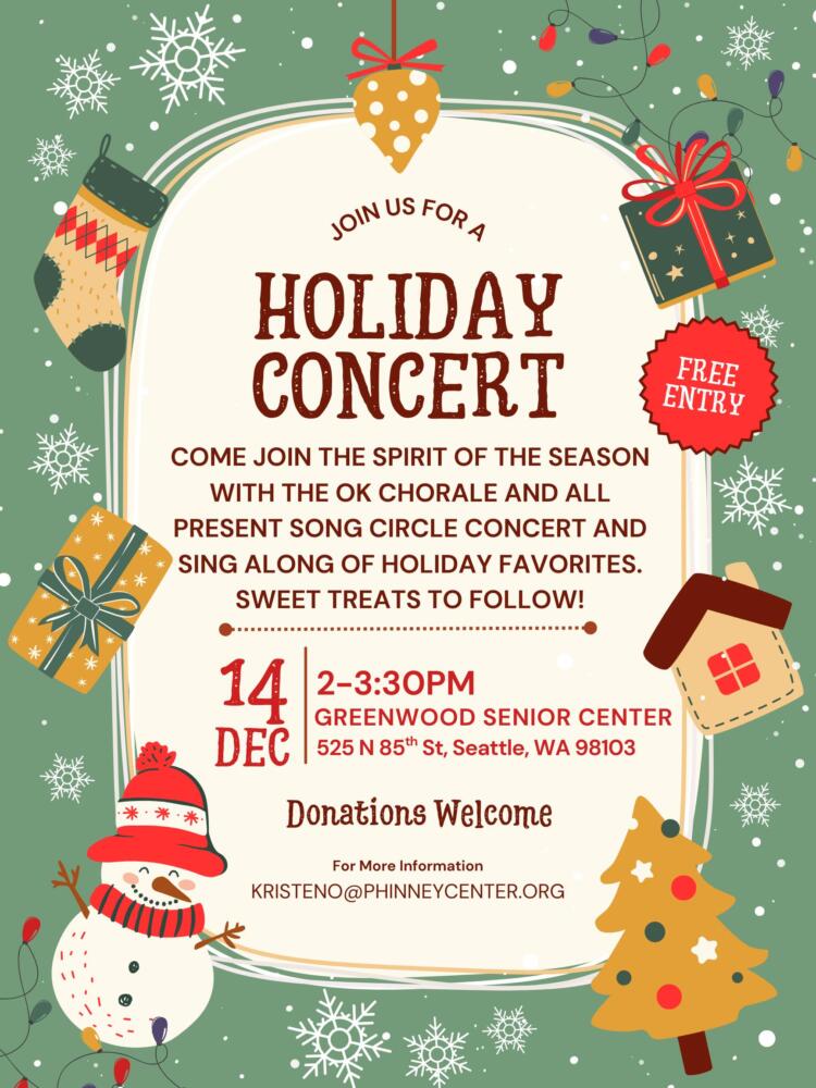 - Join us for a Holiday Concert & Sing Along on Sunday, Dec. 14, 2-3:30pm.